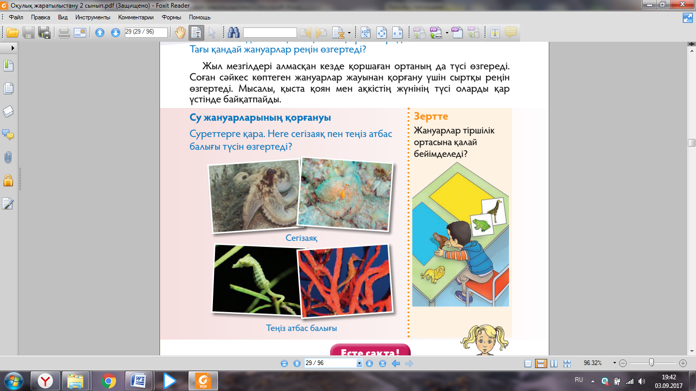2.1.2.3 - бақылау нәтижелерін шартты белгілердің көмегімен белгілей білу; 2.2.2.2 - жануарлардың тіршілік ортасына бейімделу жолдарын сипаттау; |