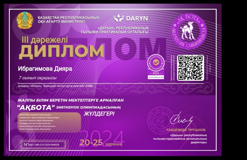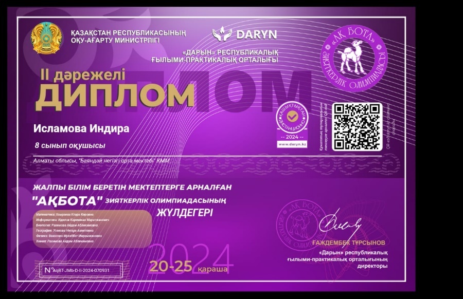 Биология пәнінен Амражанов Идаят үшінші орынға ие болды.