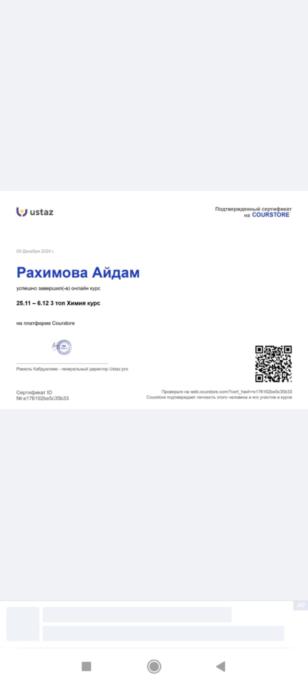 Химия пәнінен Рузиева Ясмина үшінші орынға ие болды.