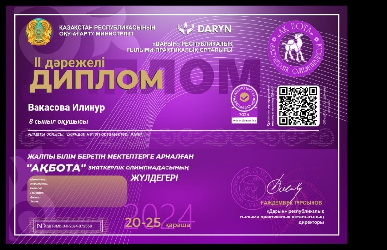 Математика пәнінен Манашова Азалия екінші орынға ие болды.
