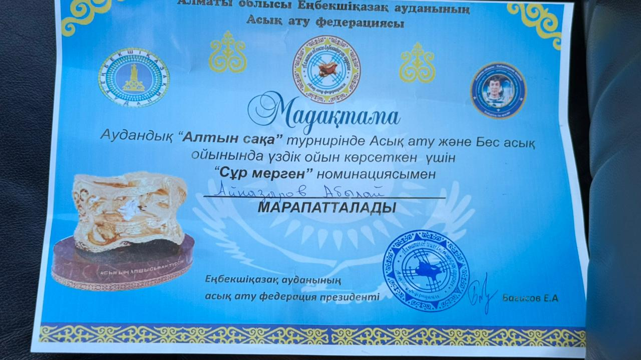 Желтоқсан айында аудандық «Алтын сақа» турнирінде Асық ату және Бес асық ойында үздік ойын көрсеткен үшін «Сұр мерген» номинациясымен дене шынықтыру пәнінің мұғалімі Айназаров Абылай Калданович марапатталды.