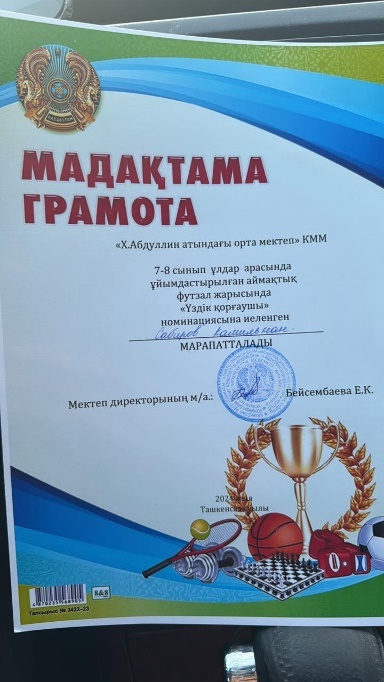 Желтоқсан айында Х.Абдуллин орта мектебінде 7-8 сынып ұлдар арасында ұйымдастырылған аймақтық футзал жарысында «Үздік қорғаушы» номинациясына иеленген «Баяндай негізгі орта мектебі» КММ оқушысы Сабиров Камильжан марапатталды.