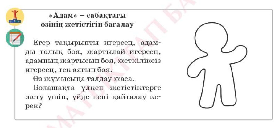 Оқушы жаңа тақырыпты қорытындылап бүгінгі сабаққа кері байланыс орнатады. Оқушылар бүгінгі сабақ түсінгендігі жөнінде 3 дәлел келтіреді Егер тақырыпты игерсең, адамды толық боя, жартылай игерсең адамның жартысын боя, жеткіліксіз игерсең, тек аяғын боя. Өз жұмысыңа талдау жаса. |