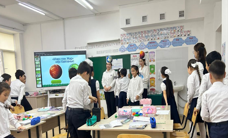 Мақсаты: Оқушылар бір-біріне сабаққа деген жақсы көңіл күй тілеу. Үй тапсырмасын әр топ бойынша оқушылар айтады. «wordwall.» платформасы арқылы оқушылар өткенді қайталайды Жұмбақта жасырылған заттың қасиеттерін сипаттайды. Бейнебаянды тыңдайды. Сұрақтарға жауап береді Жер мен Марсты салыстырады Ауаның құрамымен танысады. Сұрақтарға жауап береді Суретшінің қатесін табады- Дәлелдеу пікірі арқылы қатені түзеп айтады Бейнебаянды тыңдайды. Пікірлерін айтады. Тақтаға күннің жадын жазады. Есте сақта! Дәптерге жазады