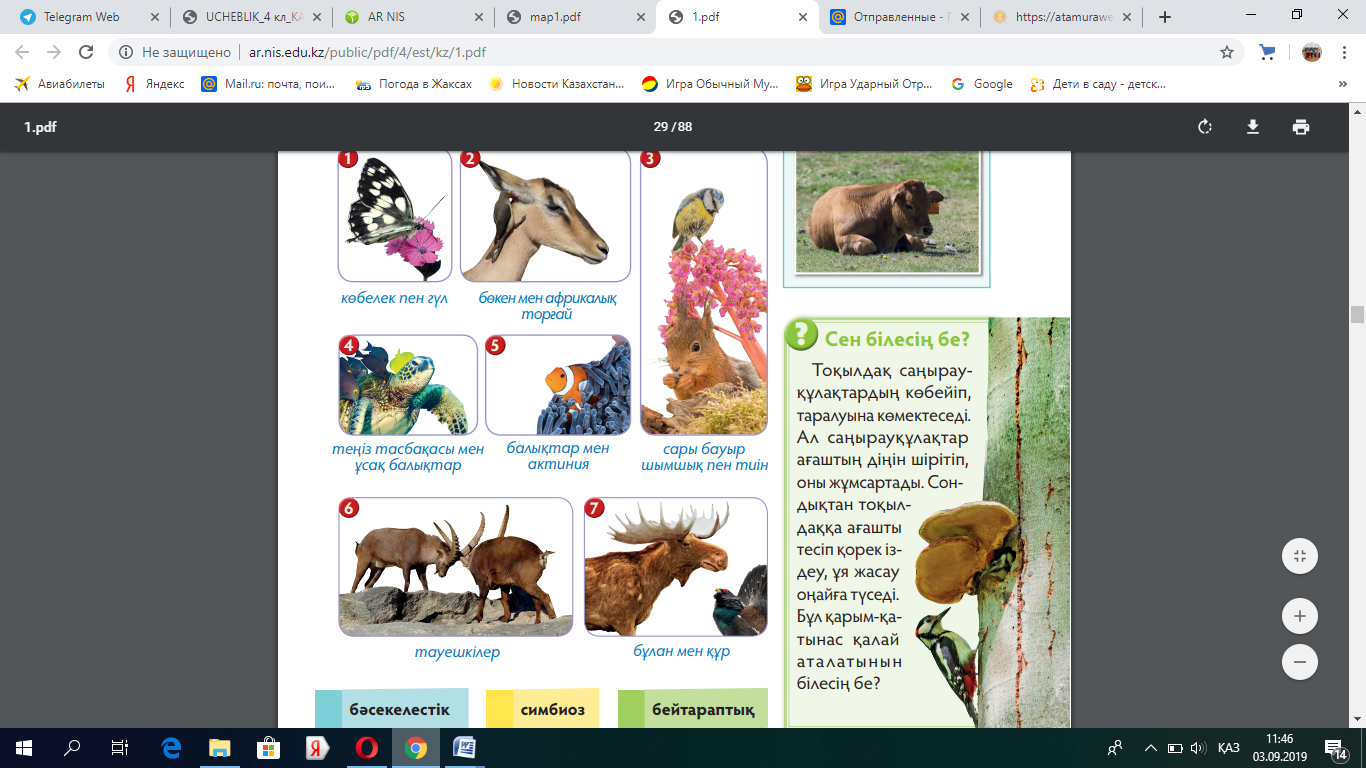 2-тапсырма Жікте Суреттердегі тірі ағзалар арасындағы қарым-қатынас мысалдарын сипатта. Оларды қандай топтарға біріктіруге болады? Көмекші сөздерді пайдалан. Жауабыңды түсіндір. Бәсекелестік топ: тауешкілер,теңіз тасбақасы мен ұсақ балықтар Симбиоз: бөкен мен африкалық торғай,көбелек пен гүл Бейтараптық топ: бұлан мен құр,сары бауыр шымшық пен тиін,балықтар мен актиния