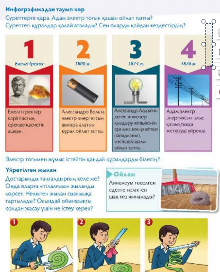 (Т, Д) 2-тапсырмада тәжірибелік кезең жүзеге асырылады. А) Зертте. -Заттарды қандай әдістермен электрлендіруге болады? Ә) Инфографикамен жұмыс. -Суреттерге қараңдар. Адам электр тогын қайдан ойлап тапты? -Суреттегі құралдар қалай аталады? Сен оларды қайдан кездестірдің? -Электр тогымен жұмыс істейтін қандай құралдарды білесіңдер? Б) Үйретілген жылан. Достарыңа оқулықтағыдай тілалғыш жыланды жасап көрсетіңдер. Неліктен жылан сызғышқа қартылады? Оны қолдан жасау үшін не керек? Б) Ойлан. -Линолеум төселген еденге шаң неге тез жиналады? Ә) Мәтінмен жұмыс. Саралаудың «Дереккөз» тәсілі жүзеге асады. Кейбір оқушыға: - Дереккөздерден электр тогы туралы мәліметтер іздеп тап. Сыныптастарыңа таныстыр. |