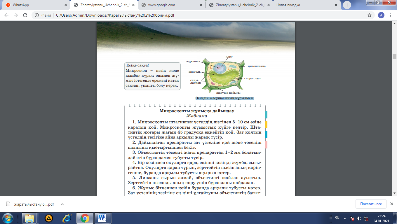 Оқушылар микроскоптың құрылысын және мектепте қолданатын микроскоппен жұмыс істеу ережесін біледі. |