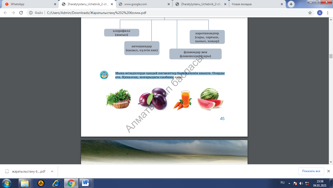 2. Егер табиғатта фотосинтез үдерісі жүрмесе, онда әлем қалай өзгеріп кетеді? Өз ойыңды айтады. Фотосинтез үдерісі жоқ әлемнің суретін салады. 3. Мына өсімдіктерде қандай пигменттер басым екенін анықтайды. Оларды атайды.