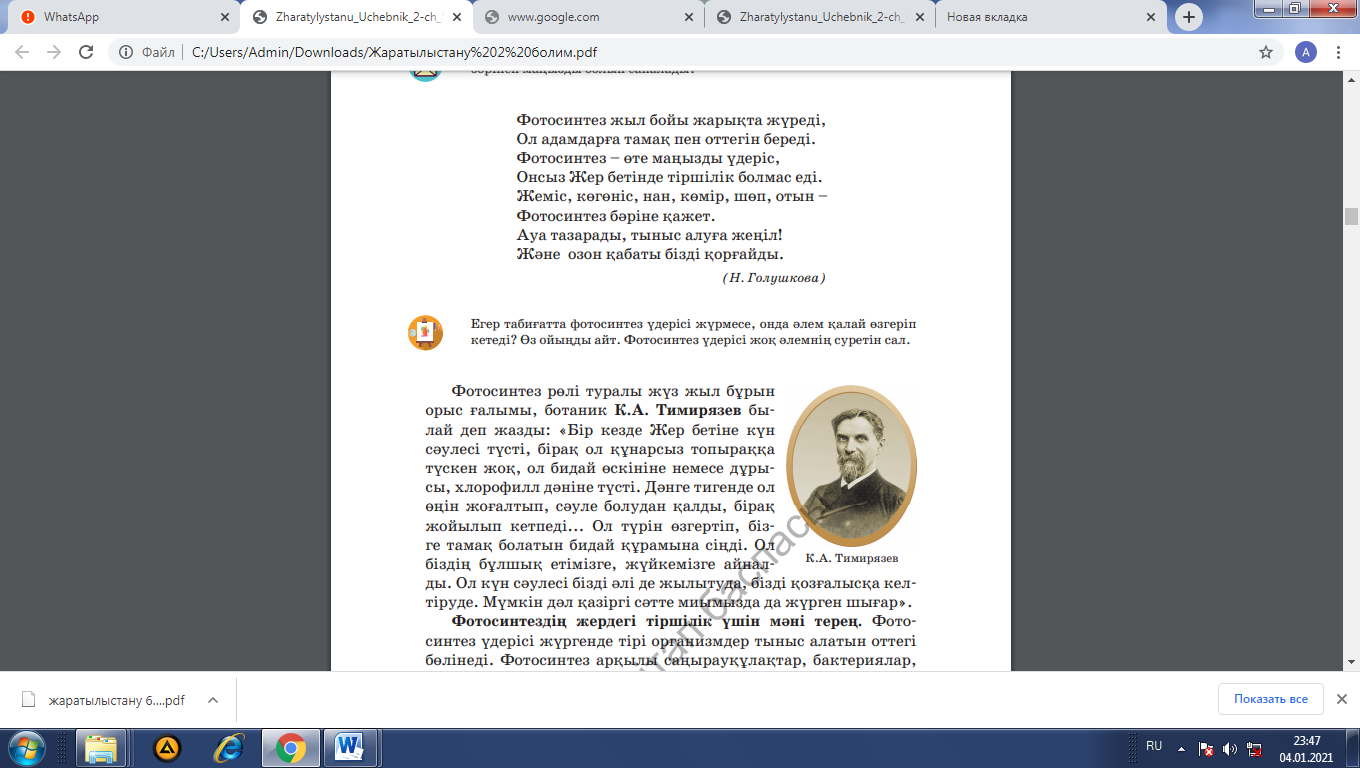 Дескриптор: - Фотосинтез үдерісі нәтижесінде өсімдіктерді жануардан ерекшеліктерін ажырата алады. Жұптық жұмыс. 1. К.А. Тимирязевтің еңбегін сипаттап беріңіз.