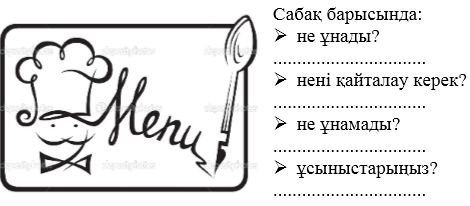 Үй тапсырмасы: Тақырып бойынша тест құрастырыңыз. Рефлексия: «Ресторан» немесе «Меню» әдісі арқылы рефлексия жүргізіледі: