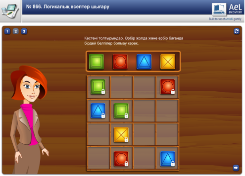 Оқушылар назарын сабаққа аудару , оқу құралдарын, сабаққа дайындығын тексеру. Оқушыларды сандар реті / 1,2,3 / бойынша топқа бөлу. Үй тапсырмасын әр топ мүшелері жұптаса отырып тексереді. Ширату жаттығулары: №1.«Артығын алып таста». Кестені толтырыңдар. Әрбір жолда және әрбір бағанда бірдей белгілер болмау керек.