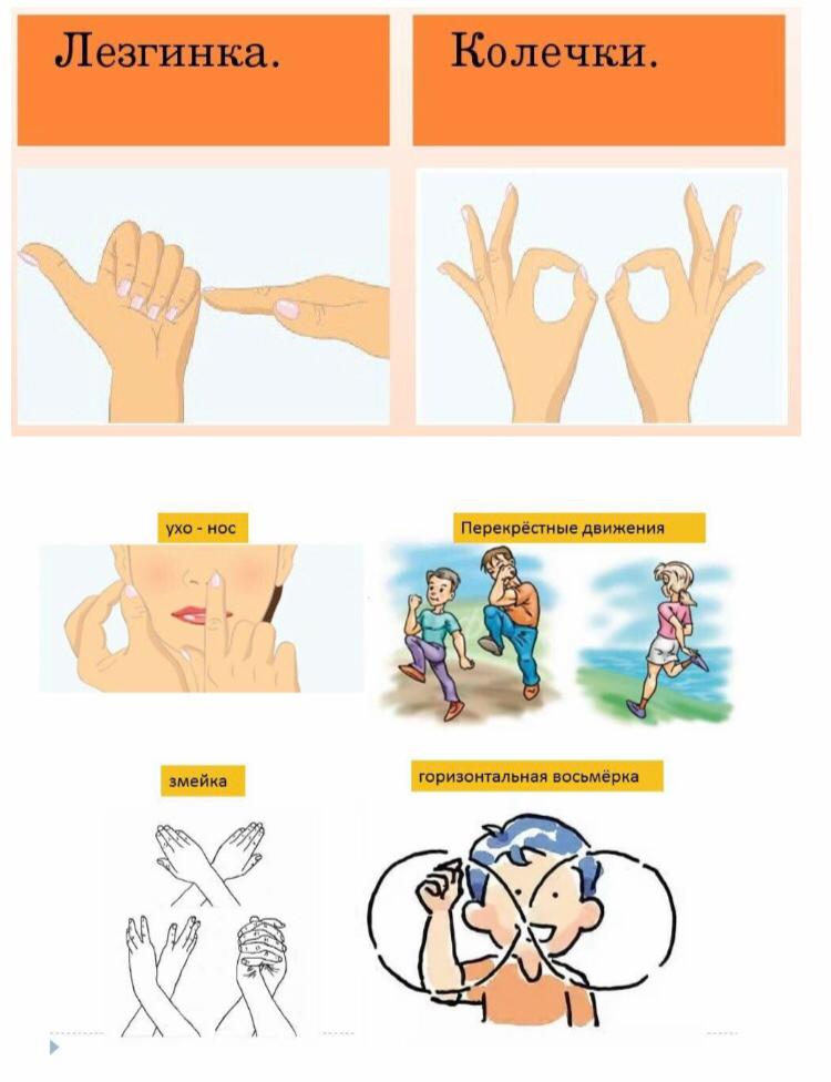13. Айқас қадамдар. Баланың қимылын уақытында үйлестіреміз қолдың қозғалысы бір мезгілде қарама-қарсы аяқты жылжытты. Оң алақан жүргенде қол сол жақ тізеге, сол қолдың алақаны оңға тиеді. Шынтақ жүргенде оң қол сол тізеге, сол қолдың шынтағы оңға тиеді. Сол жаққа жүргенде оң аяғымды орап, оң және сол қолды айналдырамын оңға, қозғалғанда сол аяқты оңға, екі қолды бұрамыз солға қарай - және көлденең қадамның басқа модификациялары.