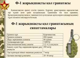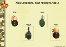 - Оқулық мәтінін пайдалана отырып, шабуылдық және қорғаныс гранаталарының ұрыстық қасиеттерін салыстырады және ұқсастықтары мен айырмашылықтарын айтып түсіндіреді. |