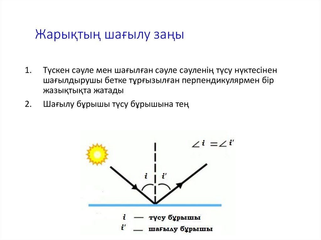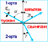 II.Мұғалімнің шолуы(толық сыныппен жұмыс) W.Екі ортаны бөлетін шегара арқылы өткенде, жарықтың таралу бағытының өзгеруін жарықтың сыну заңы деп аталады. Сынған сәуле мен екі ортаны бөлетін шекараға сәуле түскен нүктеде тұрғызылған перпендикуляр арасындағы бұрышты сыну бұрышы деп (ɣ) атайды.