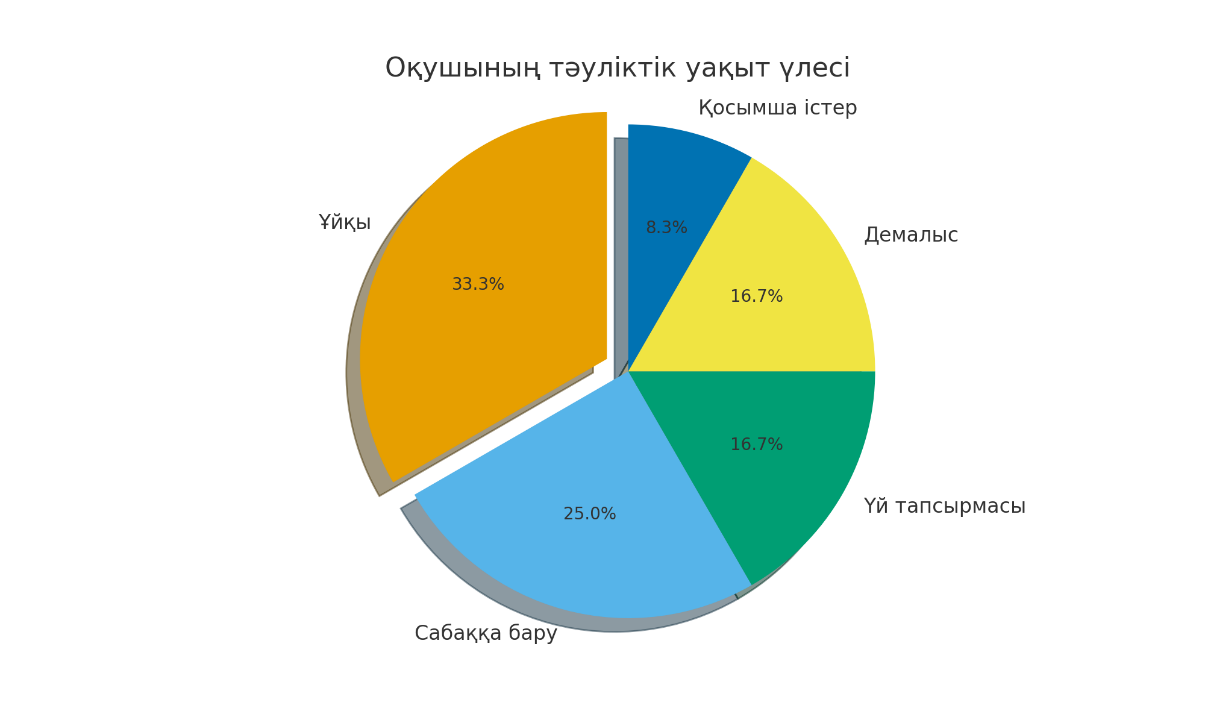 Практикалық маңыздылығы: Бұл жобаның нәтижелері оқушылар мен мұғалімдерге уақытты тиімді жоспарлауға, оқу мен демалыс арасындағы тепе-теңдікті сақтауға көмектесе алады. Жобада ұсынылған модельді болашақта білім беру саласында кеңінен қолдануға болады.