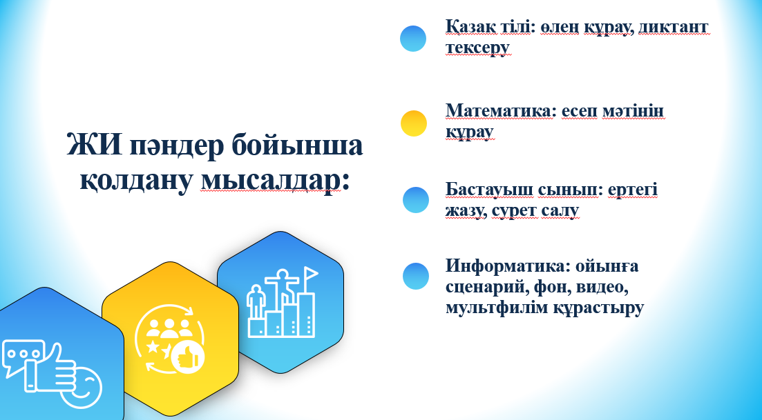 Жаңа форматтағы сабақта мұғалім – бағыттаушы, ал оқушы – білімді өз бетінше меңгеруші тұлға. Жасанды интеллект осы үдерісті тиімді ұйымдастыруға көмектесетін қуатты құрал болып табылады.