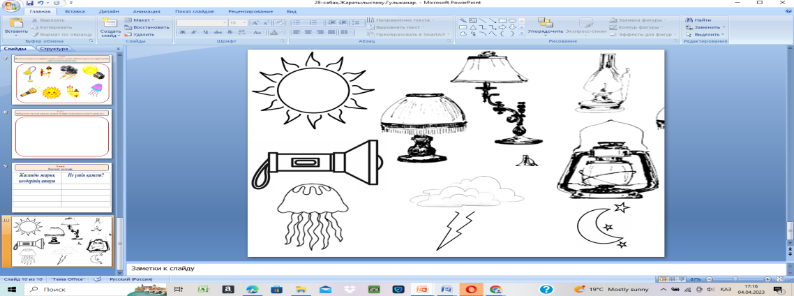 Психологиялық ахуал қалыптастыру «Шуақ сыйла» әдісі Шашы алтын, көзі от Шыға ғой күн тезірек. Жылу берші, шуақ берші Маған, оған, досыма Тағы, тағы, тағы да. Өткенді пысықтау «Галереяға саяхат» әдісі 1.Күн туралы айт 2.Ай жарық шаша ма? 3.Қараңғы бізге керек пе? 4. Жарықтың пайдасы туралы білесің бе? 5. Күн сөніп қалса не болады деп ойлайсың? Жаңа тақырып «Күн мен түн» ойыны ойналады. -«Күн мен түн» ойынын ойнағанда қандай іс-әрекеттер жасадық? -Қай кезде қараңғы болды? -Қай кезде жарық болды? -Түнде жарықты не береді? -Ал күндіз ше? -Оларды біз қандай жарық көздері деп атадық? -Дұрыс, табиғи жарық көздері. -Түнгі уақытта қандай жарық көздерін пайдаланамыз? -Дұрыс, шам, электр жарығы, көше шамы, шамшырақ, қолшам. Бұлар- жасанды жарық көздері. Оларды адам өз қолымен жасайды. Сонымен бүгінгі сабақта: СЕН -Жасанды жарық көздерімен танысасың. -Жасанды жарық көздерінің адам өміріне қажеттілігін түсінесің. -Жасанды жарық көзін пайдалану кезіндегі қауіпсіздік шараларын білесің. Әр қатардан бір оқушы шығарып суретті таңдатамын. Сол сурет бойынша топ аталады және тапсырманы орындайды. Топтық жұмыс 1-топ Электр шамын қай кезде қолданамыз? Оны пайдаланғанда нені ескеру керек? 2-топ: Қолшамды қай кезде пайдаланамыз? Оның жарығы қандай? 3-топ: Майшамды қай кезде пайдаланамыз? Ол неден қуат алады? Бірлескен жұмыс ЕБҚ және ЕҚБ Жасанды жарық көздерін тауып, оларды тиісті түстермен боя.