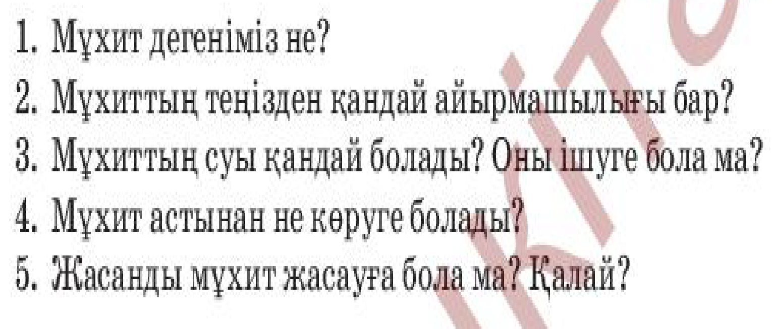 Тыңдалым,айтылым. Тұз-соль Су перісі-русалка Балдыр-водоросли Мұхит-океан Жасанды- искусственный Қоңыр-коричневый Айтылым «Суреттер сөйлейді» әдісі бойынша оқулықта берілген суреттер бойынша талқылау. Кітаптағы суретке қарап, көз алдымызға осы мұхитта жүрміз деп елестетеміз. Суретте қандай нәрселер көрсетілген. Олар не үшін қажет? Айтылым Сұрақтарға жауап бер.
