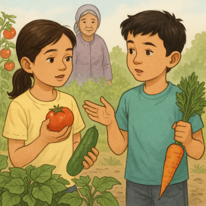 бақшадан піскен қызанақ, қияр, сәбіздерді жинап, әр жемістің сыртқы