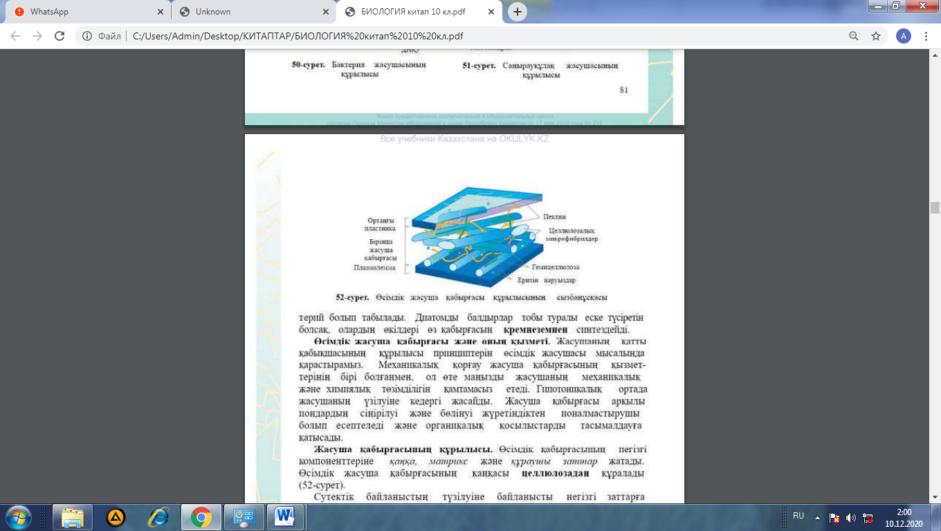Дескриптор: Жалпы - 3 балл 1.Жасуша органойдтарын түрлерін біледі 2. Жасуша органойдтарының қызметін ажыратады. 3.Жасуша қабырғасының құрылысын түсінеді. |
