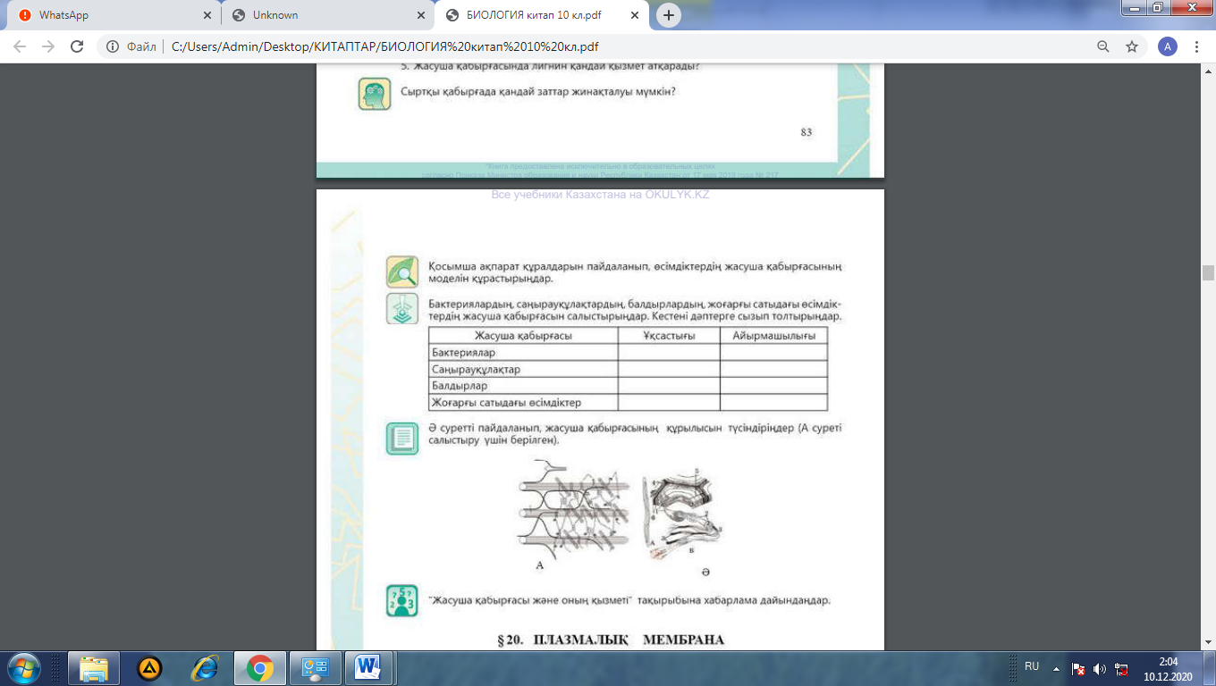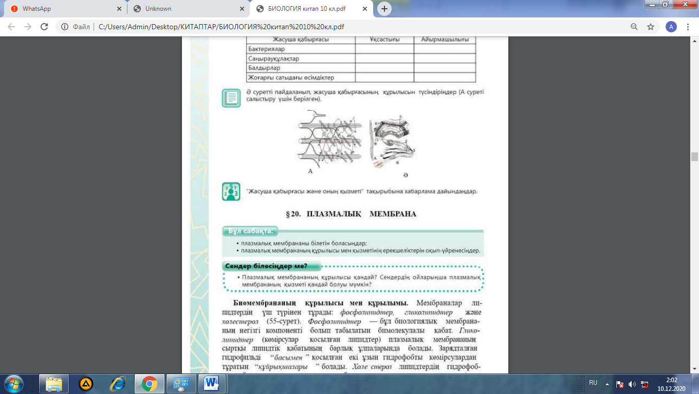 Дескриптор: Жалпы - 3 балл 1.Бактерия, саңырауқұлақ, өсімдік жасуша құрылысы айырмашылқтарын біледі. 2. Талдау жасап айырмашылықтарын анықтайды. Мембранасына қарай топтастыра біледі. 3.Кестені дәптерге сызып толтырады |