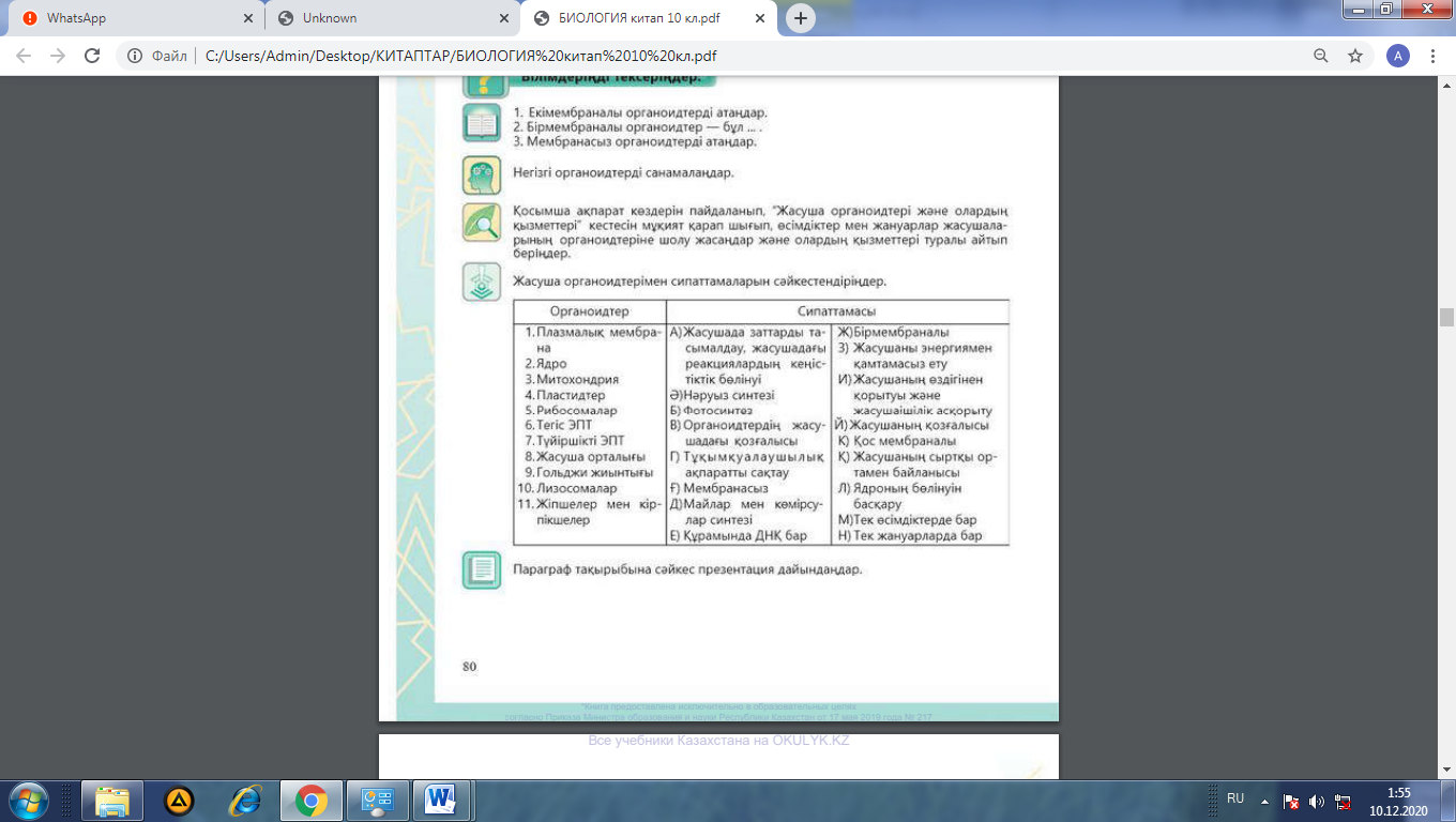 2-тапсырма: 2.1.Жасуша органоидтерімен сипаттамаларын сәйкестендіреді.