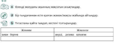 Оқушы Сөйлемдерді, ойын, көркем жеткізіп, ӘТН ды жүйелі қолдануы арқылы функционалды сауаттылық дағдыларын қалыптастырады. Сұрақтарға жауап бере отырып берілген тапсырманы орындайды. Тұтас емес мәтіндерді толық мәтінге айналдырып, салыстырады, өңдейді. Мәтін бойынша жазба жұмысының жоспарын құрастырады Әртүрлі жанрда мәтіндер құрастырады Өлеңді оқып берілген сөз қолданыстары өз сөздеріңмен түсіндіріп жазыңдар. ЕББҚ бар оқушы тапсырманы орындайды |