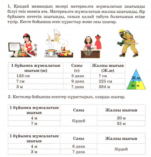 (Ұ, Д) 1- тапсырмада тақтамен жұмыс жүзеге асады. 1)Қандай мамандық иелері материалға жұмсалатын шығынды білуі тиіс екенін атаңдар. Материалға жұмсалатын жалпы шығынды, бір бұйымға кететін шығынды, санын қалай табуға болатынын естеріңе түсіріңдер. Кесте бойынша есеп құрастырыңдар және шығарыңдар. А)Тігінші бір жейдеге 123см мата жұмсайтын болса, 3 жейдеге қанша мата керек? Ш: 123см*3=369см Ж: 3 жейдеге 369см мата керек. Ә) Тігінші 225см матадан 9 дана белдемше тікті. Сонда 1 белдемшеге қанша мата керек? Ш: 225:9=25см Ж: 1 белдемшеге 25см мата керек. Б) Тігінші өнер ұжымына сахналық кәстөм тігуге тапсырыс алды. 1 кәстөмге 3м мата жұмсалатын болса, 384м матадан неше кәстөм шығады? Ш: 384:3=128 Ж: 384м матадан 128 кәстөм шығады. 2) Кестелер бойынша есептер құрастырып, оларды шығар.