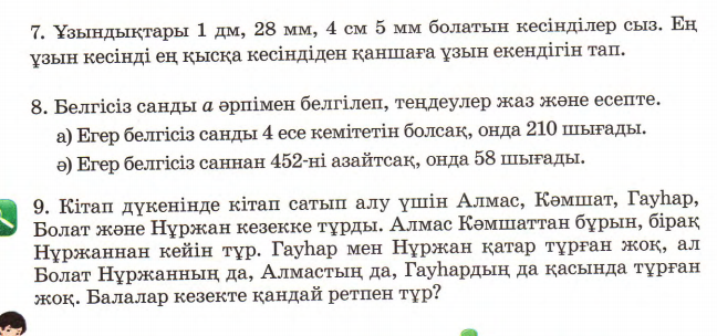 (Т) 2- тапсырма «Ойлан, жұптас, талқыла» әдісі. 3) Есептерді шығар. А) 3 адамға құймақ дайындау үшін 6 алма жұсалды. 8 адамға құймақ дайындау үшін неше алма қажет? Ш:6:3*8=16 Ж: 16 алма қажет. Ә) Тігінші 4 көйлекті сәндеу үшін 24м таспабау жұмсады. 42м таспабаумен неше көйлекті сәндеуге болады? Ш:42:(24:4)=7 Ж: 42м таспабаумен 7 көйлекті сәндеуге болады. Б) Сырлаушы 6 метрлік қоршауды бояу үшін 3 кг бояу жұмсады. 18 кг бояумен неше метр қоршауды бояйды? Ш:18:(6:3)=9 Ж: 18 кг бояумен 9 метр қоршауды бояйды. В) Ағаш ұстасы 5 орындық жасау үшін, әрқайсысына теңдей 40 бұрандалы шеге жұмсады. Егер ол 72 бұрандалы шеге жұмсаған болса, онда қанша орындық жасады? Ш:72:(40:5)=9 Ж:9 орындық жасады. 4) Өрнекті баған түрінде жазыңдар, есептеңдер. Тексеріңдер. А) 254*3=762 556:4=139 148*2=296 777:3=259 127*5=635 486:3=162 119*7=833 894:3=298 Ә) 609-495=114 98+329=427 850-61=789 970-602=868 780-65=715 530-432=98 974-401=573 300-49=251 Саралау тәсілі: «Тапсырма» арқылы жүзеге асады Кейбір оқушыға: - Ұқсас тапсырмалар құрастыр. (Т) 3- тапсырма дәптермен жұмыс. 5) Өрнектер құрастырып мәнін табыңдар. 7*7-5*3=34 8*7+7*0=56 7*9-9*2=45 6*7-6*4=18 7) Теңдеулер құрастырып, оларды шешіңдер. 120+х=240 260-с=240 х=240-120 с=260-240 х=120 с=20 120+120=240 260-20=240 240=240 240=240 а+16=480 90+с=480 а=480-16 с=480-90 а=464 с=390 464+16=480 90+390=480 480=480 480=480 х-540=60 670-а=60 х=540+60 а=670-60 х=600 а=610 600-540=60 670-610=60 60=60 60=60 у-170=300 у+170=300 у=300 +170 у=300-170 у=470 у=130 470-170=300 130+170=300 300=300 300=300 Саралау тәсілі: «Тапсырма» арқылы жүзеге асады Кейбір оқушыға: