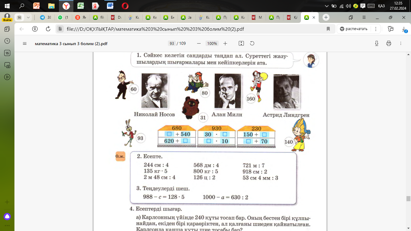 Ұйымдастыру кезеңі: Психологиялық ахуал орнату. «Қал қалай?» ойыны Үй тапсырмасын тексеру №7, 91-бет 17 см * 4 = 68 см 147 саг : 3 = 49саг 102 кг * 2 =204 кг 17 кг * 4= 68 кг 64 мин : 2 = 32 мин 422 м : 2 =211 м «Ой қозғау» әдісі Сәйкес келетін сандарды таңда. Суреттегі жазушылардың шығармалары мен кейіпкерлерін ата. Сабақтың тақырыбы мен мақсатын хабарлау