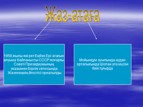 Барлығы: Жазылбек Қуанышбаев ата туралы білім алады Оқушыларды қазақтың еңбекқор даңқты перзентіне деген қызығушылығы айқындалады. Шопанның ерлігін сипаттайды |