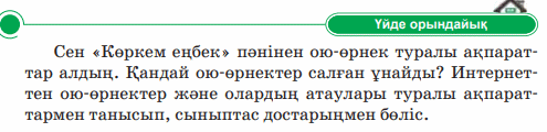 Мұғалімді тыңдайды 1-тапсырманы орындайды 2-тапсырманы орындайды Тапсырманы орындайды 3- тапсырманы орындайды Сергіту сәтін жасайды 4-тапсырманы орындайды |