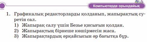 Дескриптор: - суреттің көлемін , не себепті өзгертетінін айтады Нысанға градиент қосу маңыздылығын айтады 2 балл Дескриптор: -Суреттерді салыстырып, ойын айтады 2 балл Дескриптор: Сұраққа жауап береді Дескриптор: -Графикалық редакторларды пайдаланып, жапырақтың суретін салады 2 балл Дескриптор: -онлайн платформада сұрақтарға жауап береді 2 балл |