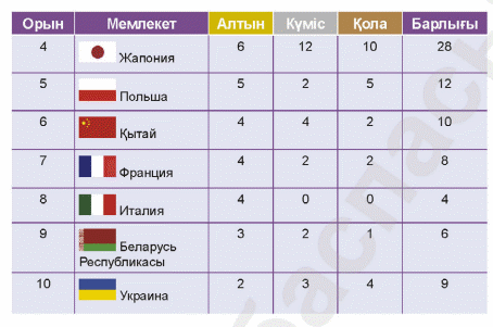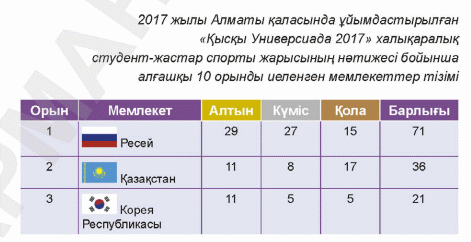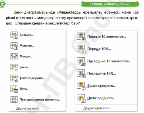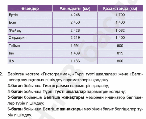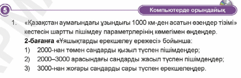 Дескриптор: - Шартты пішімдеу құралы қандай параметрлерден тұратынын айтады 2 балл Дескриптор: - Вен диаграммасында «Ұяшықтарды ерекшелеу ережесі» және «Бірінші және соңғы мәндерді іріктеу ережелері» параметрлерін салыстырады 2 балл Дескриптор: Сөйлемді аяқтайды Дескриптор: -«Қазақстан аумағындағы ұзындығы 1000 км ден асатын өзендер тізімі» кестесін шартты пішімдеу параметрлерінің көмегімен өңдейді 2 балл Дескриптор: -онлайн платформада сұрақтарға жауап береді 2 балл |