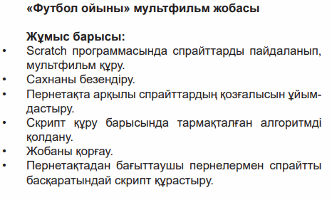 Дескриптор: -Алдыңғы жобаны жалғастырады - Қыздың скриптісін пернетақтадан оңға бағыттаушы пернемен басқарылатындай етіп құрастырады Сергіту сәті «Балық, құс, аң» Мақсаты: Жүргізуші ойыншылардың жанына барып жаймен ғана «балық, құс, аң» - деп айтып-айтып келеді де, бір ойыншының жанына барған кезде дауысын қаттырақ шығарып: - Балық!(немесе аң, құс) –деп айтып қалады. Сол мезетте ол ойыншы бірден өзі білетін кез-келген балықтың атын айтып үлгеруі керек. Айта алмай қалса, ол ойыннан шығады. Ойын ең соңғы ойыншы қалғанша жалғаса береді EБҚЕ бар балалар үшін тапсырма Анимация деген не? Дискриптор Сұраққа жауап береді Сабақты қорытындылау. 4-тапсырма«3 таяқша» әдісі Жаңа тақырыпқа байланысты 1 сұрақ 1 жауап 1 идея әр топ даярлап, көпшілікке салады. Дескриптор: -жаңа тақырып бойынша сұрақтарға жауап береді |