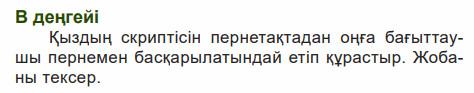 Дескриптор: -Қыздың скриптісін пернетақтадан оңға бағыттаушы пернемен басқарылатындай етіп құрастырады Жеке жұмыс. Компьютермен жұмыс 3-тапсырма «Ой қозғау» әдісі арқылы тапсырманы орындау