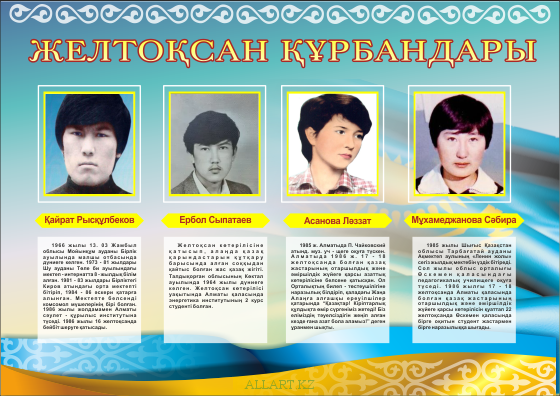 1986 жылы 16 желтоқсанда Республика Орталық комитетінің 5-пленумы болды. Небәрі 18 минутқа созылған осы пленумда Қазақстан республикасын 25 жыл басқарып келген Дінмұхаммед Ахметұлы Қонаевтың орнына Геннадий Васильевич Колбин тағайындалды. Бұған 1987 жылы 17 желтоқсанда Алматы қаласында мыңдаған қазақ жастары наразылық білдіріп, шеруге шықты. Олар: "Тәуелсіздік керек, қазақ халқының өз көсемі сайлансын» деген тілек білдірді, көтеріліске жастар ешбір жаман оймен барған жоқ. Олар бейбіт жолмен тәуелсіздікке қол жеткізу үшін қатысқан. Аңғал сеніммен шыққан бейкүнә қыз-жігіттер «контрреволюционерлер» емес еді, Олардың ойы халықтың құқықтары мен проблемалары туралы сөз жүргізу еді. Үкімет үйінде жастар шеруін қуғындау үшін астыртын жоспар құрылып жатты. Ал алаңдағы жастар жайбарақат, аңғал, алаңсыз еді. Оларды бір қолында қалқаны, бір қолында шоқпары бар қарулы сақадай сай әскерлер қарсы алды.Оларға зәбір көрсетілді. Жастар түрмеге қамалды. Өз елінің тәуелсіздігін талап еткен жастарға «бұзақы», «ұлтшылдар» деген кінә тағылды. Дүрбелең. Алматы қаласы. 1986 жылдың 17 желтоқсанында таңғы сағат сегізде Брежнев алаңына жастардың алғашқы тобы келді. Олардың саны 200-300-дей еді. Бара-бара олардың қатарлары көбейді. Бәрі де қазақ жастары еді. Олар студент қыз-жігіттер, жас жұмысшылар, оқушылар. Қолдарында «Қазақстанды өз ұлтынан шыққан басшы басқарсын! Қазақстанды әркімге билетпейміз!» деген ұрандар жазылған. Алаңға 50 мың әскер, 20 мың полиция, 16000 жасақшы шоғырландырылды. Ал шеруге шыққан қазақ жастарының саны 10 мыңға жуық. Сонда да олар міз бақпайды, қасқайып тұрып, өз талаптарын қоюда. Желтоқсанның 17-нен 18-не қараған күні алаң айнала қоршауға алынды. Шеруге шыққан жастар үш қатарлы қоршаудың ішінде қалды. Жасақшылар, милиция, әскер.Бір кезде өрт сөндіретін қызыл машиналар көрінді. 20 шақты машина жастардың үстіне суды жаңбырдай боратты. Жұрт әрлі-берлі қашқалақтап, тарай қоймады. Милиционерлер шерудің алдыңғы сапында жүрген жастарды алып кетіп жатты. Қақтығыс басталып, опыр-топырға ұласты. Алаң қанды сойқанға айналды. Қарулы күш қарусыз адамдарды құмарлана ұрып-соғып, бас жарып, көз шығарып, шаштан жұлып, аяқтан сүйреп, өлер халге жеткізіп мертіктірді. Қараңғы түскеннен кейін ығыстыру операциясы басталды. Сойыл, арсылдаған иттерді пайдаланды. Тарихта «құйын» операциясы жоспардағыдай аяқталды. Қанға бөккен Алматы көшелері қаңырап бос қалды. Қазақтың әр үйіне үрей кірді. Әр қазаққа ұлтшыл, маскүнем, нашақор деген айып тағылды Алаңға жиналған қазақтарды қуғындау басталды. 17-25 желтоқсан аралығында ішкі істер бөліміне 83 студент, 1168 жұмысшы, 49 қызметкер, 164 училище оқушысы, 102жұмысшы, 1214 комсомол мүшесі, 54 партия мүшесі әкелінді. 1986 ж 25 желтоқсанынан 1987 жылдың шілде айына дейін 5327 адам прокуратурада, 800 адам мемлекеттік қауіпсіздік комитетінде жауапқа тартылды. Адамдар ату жазасына кесілді, кейбіреулерін 20 жылға бас бостандығынан айырды. Соның бірі қыршын кеткен марқұм Қайрат Ноғайбайұлы Рысқұлбеков еді. Қайрат Жамбыл облысы Мойынқұм ауданында Бірлік ауылында дүниеге келген. 1987 жылы 23 мамыр-14 маусым аралығында Жоғарғы сот Қайратты ату жазасына кесті. Сәбира Мұхамеджанова өзі тұратын жатақхананың терезесінен секірді. Ләззат Асанова Алматы облысы Панфилов ауданы Ақжайық ауылында дүниеге келген, 16 жасында өмірден озды. Ләззатты жерлеу кезінде