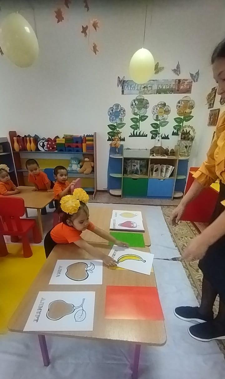 індетті:Негізгі түстерді дұрыс атауын ,жемістер