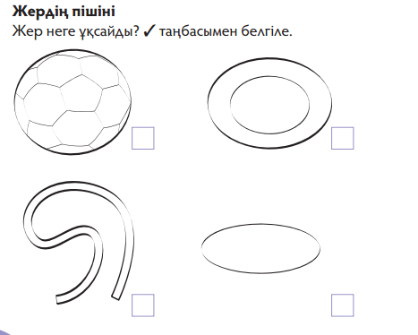 пікірін тыңдау) Дәптермен жұмыс: Жердің пішініне ұқсас затты белгілеу.