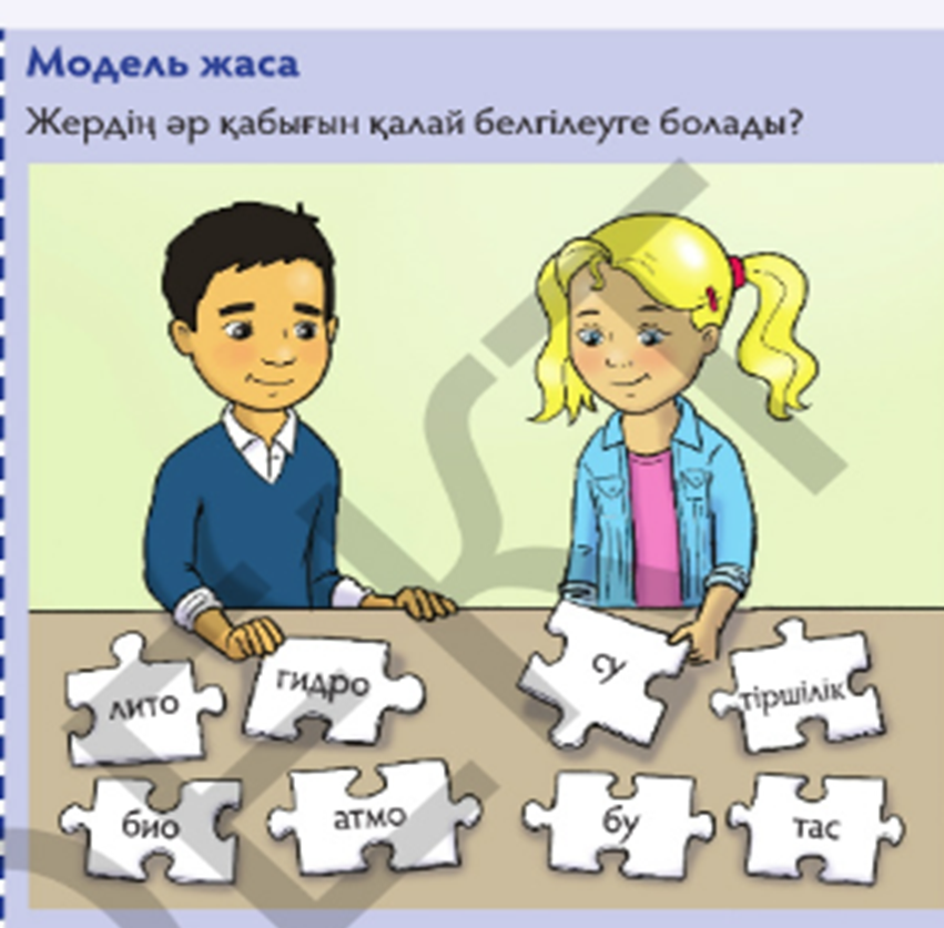 Өткенді пысықтау Қазіргі заманғы және ежелгі заманғы еңбек құралдарын салыстырып, қорытынды ой жазып кел. Құндылық мақсаты: Түрлі объектілердің жеке белгілерін салыстыра білу, заттарды жалпы белгілер бойынша талдау, біріктіру Жаңа тақырып ФС тапсырмасы 1-тапсырма «Жеміс себеті» әдісі Топ шеңбер құрып орындықта отырады. Оқушылар берілген ресурс бойынша түсінгендерін айтып шығады. Жердің төрт қабығы болады. Олар сфералар деп аталады.Олар атмосфера, биосфера, литосфера, гидросфера деп аталады. Осы жердің төрт қабығының негізін түсіну үшін оқулықта берілген тақырыпты оқып, танысамыз. Топтық жұмыс 2-тапсырма «Пазл» әдісі Зерттеу жұмысын орындау үшін оқушыларға әр қабатта орналасқан нысандар мен пазлдарда жазылған сөздер арасындағы ортақ белгілерді табу керек. Әртүрлі ақпарат көздерімен жұмыс жасай отырып, оқушылар олардың артықшылықтары мен кемшіліктерін айқындай алады. Топтық жұмыс 3-тапсырма «Зерттеуші» әдісі Суретте берілген жер қабығының атауын жаз. 2.Осы қабыққа жататын зат атауларын жаз. 3.Ортақ белгісі не?. Жауабы: Бірінші қабық-литосфера. Оған таулар, жанартаулар, жазықтар, шөл далалар кіреді.Ортақ нәрсе-Жер беті. Екінші қабық— атмосфера. Ауа, бұлт орналасқан. Ортақ белгісі -кеңістік. Үшінші қабық –гидросфера. Теңіз, мұхит, өзен, көлдер. Ортақ белгісі-су. Төртінші қабық-биосфера.Өсімдіктер, жануарлар, балықтар, бунақденелілер, құстар.Ортақ белгісі-тірі табиғат нысандары. ЕБҚ және ЕҚБ «Диаграмма» әдісі Диграмманың көмегімен жер қыртысын бейнелеңдер.Атауларын жазыңдар Үй тапсырмасы Жер сфераларының суретін салып, ол туралы әңгімелеп бер.Жердің біз тұратын қабаты туралы мәліметтер жинап айт. Кері байланыс