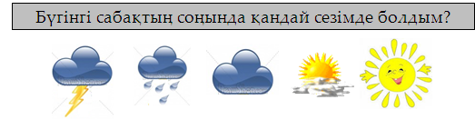 Бағалау: Оқушылар өзін-өзі бағалайды. Практикалық жұмысты орындау соңында мен қандай сезімде болдым? -деген сұраққа көрсетілген суреттер бойынша жауап береді.