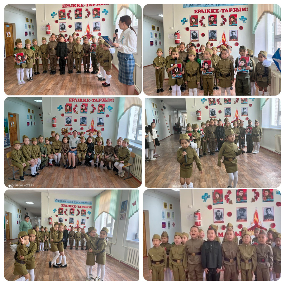 Мұғалім: Құрметті ұстаздар мен оқушылар! Адамзат тарихында Жер үшін көптеген шайқастар болды. Ең ұзаққа созылған соғыстардың бірі 1941 жылы басталып 1945 жылға дейін созылған соғыс. Төрт жылға созылған Ұлы Отан соғысы тарихта мәңгі сұрапыл соғыс болып қалды. Жеңіс күні адамзат аңсап күткен,жеңістің туын тіккен 1945жылғы 9 мамыр азаттық күрестің айбынды күні. Сол ұлы Жеңіске биыл 79 жыл. Соғысқа қатысқан ата-әжелеріміздің саны да азайды, жоқтыңқасы.Бірақ оларға көмек берген адамдарымыз бар. Ертең 9 мамыр алаңға шыққан кезде көретін боласыздар. Егімендік алғаннан кейін 1991 жылдан бастап Кеңестік Социалистік Республикалар Одағынан бөлініп шығып біздіңде өз әскеріміз, өз шекарамыз болды. 7 мамыр Республика Ұланының құрылған күні. Бұл- ел тыныштығын қорғап, бейбітшілікті қамтамасыз ететін әскери қызыметкерлерді құттықтап, құрмет көрсеткен күн. Ал құрметті ұстаздар, оқушылар 1 «Г» сынып оқушыларының «Ұранды ердің – ұрпағы қайсар» атты салтанатты жиынымызды бастауға рұқсат етіңіздер.