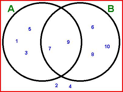 A=1; 3; 5; 7; 9 жəне B=6; 7; 8; 9; 10 жиындары берілген.