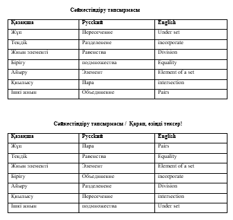 Бұл сұрaу үдeрiciне кинecтикaлық сипaт бepeдi, өз еркімен жауап беруге итермелейді. 1.Жиын дегеніміз не? 2. Қиылыспайтын жиын дегеніміз не? 3. Бос жиын дегеніміз не? 4. Айнұр, Назгуль, Сымбат, Асылым.. 5. Қоян, қасқыр, арыстан, түлкі... 6. Мектептегі балалар жиынын атаңдар 7. 2-20ға дейінгі тақ сандар жиыны 8. 1-10 ға деінгі сандардағы жұп сандар жиыны 9. Терапевт, лор, хирург, невропотолог жиыны... 10. Асық, көкпар, арқан тартыс, тоғызқұмалақ..... ҚБ: Өзін-өзі бағалайды, дұрыс жауаппен түзету жасайды. Топтық жұмыс. Сәйкестендіру тапсырмасы