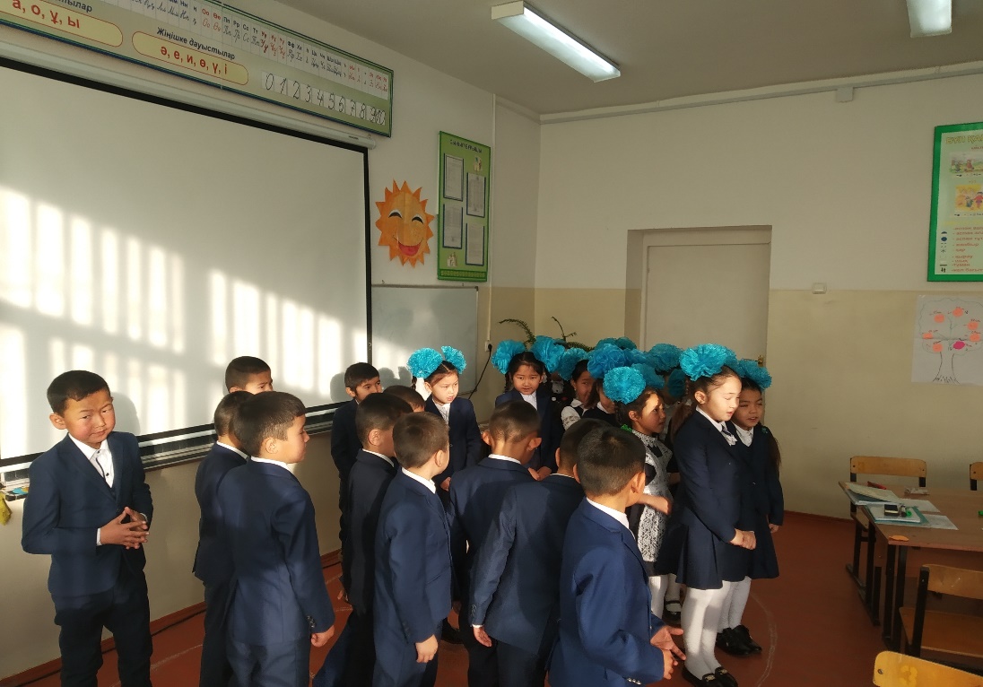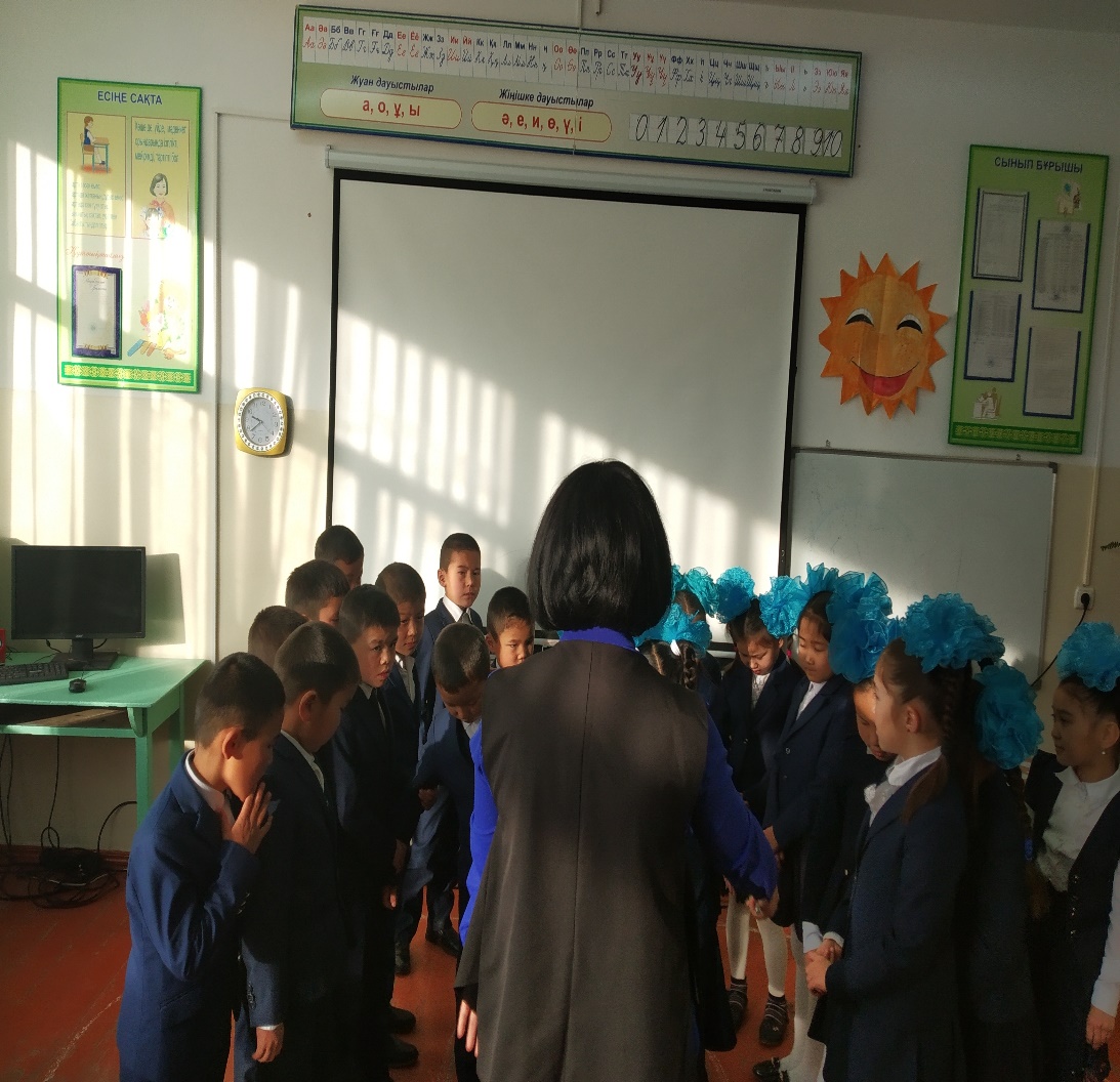 Сәлемдесу. Психологиялық ахуал қалыптастыру: Үлкенге де сіз, Кішіге де сіз. Амандасып алайық, Сіздерменен біз. Сәлеметсіздер ме? Құтты болсын Тәуелсіздік мерекесі! Халқымыздың арта берсін берекесі. Әрқашанда көрінсін тек биіктен, Түспесін ешқашанда ел еңсесі. |