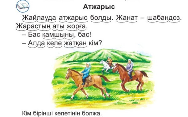 Оқу түрлерін (буындап оқу, тұтас оқу, мәнерлеп оқу, түсініп оқу) қолданады; дыбыстың мағына ажыратушы қызметін түсінеді; сызба-модель, сурет, белгілер арқылы сөз, сөйлем, шағын мәтін құрастырады; тақырыбы мен иллюстрациясы бойынша мәтіннің мазмұнын болжайды; ана тілін, Отанын, халқын, мәдениеті мен салт-дәстүрін құрметтей біледі; жазу жолын, жоларалықты, жолдың жоғарғы және төменгі сызықтарын сақтап, әріп элементтерін, әріптерді, әріптердің бір-бірімен байланысын көркем жазу талаптарына сай жазады; айтылуы мен жазылуы бірдей сөздерді көшіріп және есту, есте сақтау арқылы жазады. |