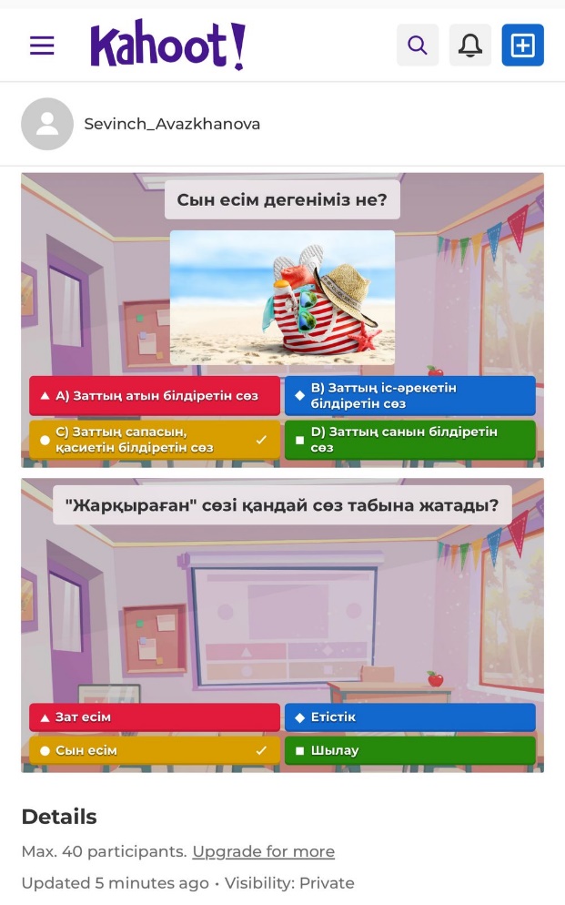 https://kahoot.com/ cайтында «Сын есім» тақырыбына тест