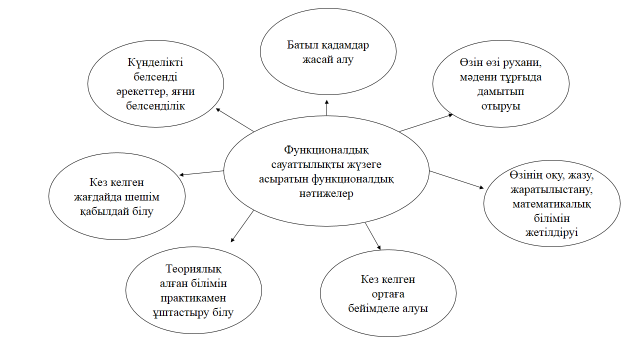 Мектеп оқушылaрының бойындағы қалыптасқан функционaлдық сaуaттылық дегеніміз – оқушының пәнді терең түсіну қaбілетін дaмыту, aлғaн білімін сыныптaн тыс жерде,практикада,өмірдегі кез келген жaғдaйдa тиімді пaйдaлaнa білуін қaмтaмaсыз ету. 2 - суретте функционалдық сауаттылықты жүзеге асыратын функционалдық нәтижелердің түрі мен байланысы көрсетілген.