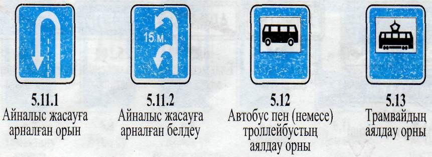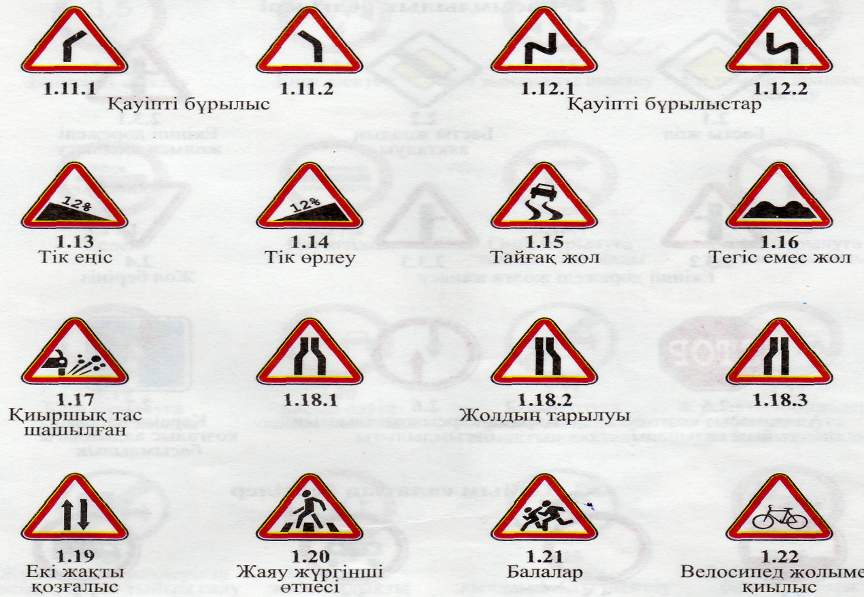 Жол белгілерін анықтай отырып, белгілерді де көрсетіп отыру: Велосипед жолымен қиылыс, Автоарна, Тұрғын аймақ, Тұрғын аймақтың аяқталу, Телефон, Тамақтану пункті, Аурухана, Ауыз су, Асхана