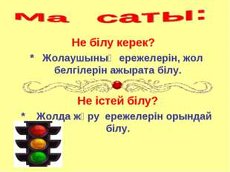 Көрнекілігі: Бағдаршам , жол белгілері салынған суреттер , интерактивті тақта, жол ережесіне арналған кітаптар.